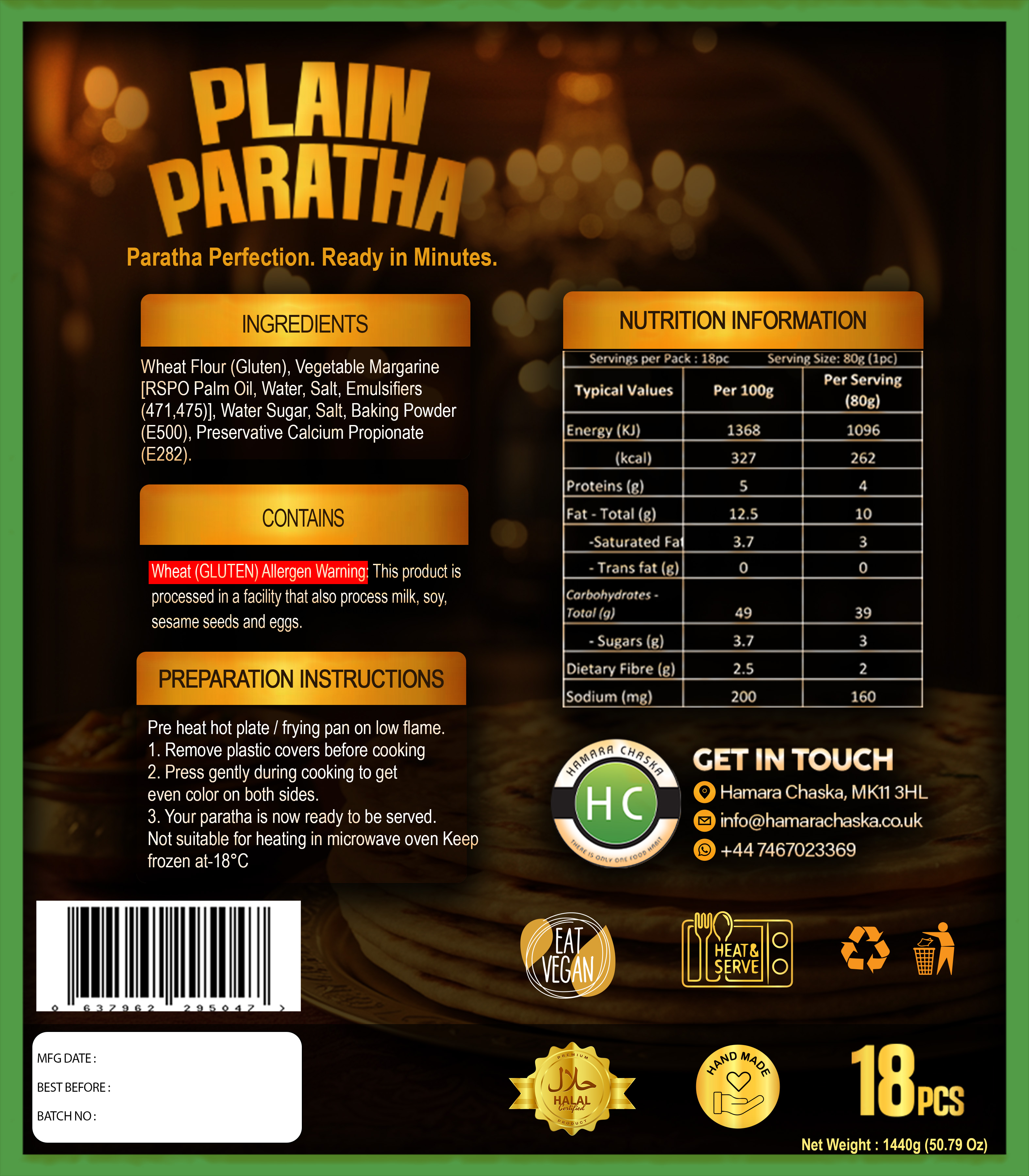 HC Plain paratha - 18 pcs per pack, 6 packs per box. MOQ 2 Boxes